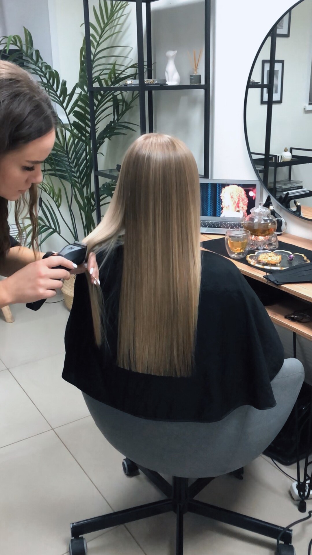 удаление секущихся кончиков/ коррекция длины / увлажнение / придание блеска/ продлевает эффект после кератина/ботокса